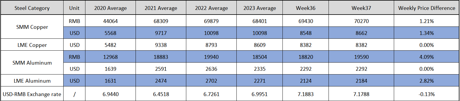 SMM Copper and Aluminum weekly price on the week 36th, 2023