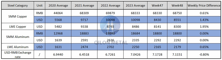 SMM Copper and Aluminum weekly price on the week 48th, 2023