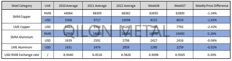 SMM Copper and Aluminum weekly price on the week 37th, 2022