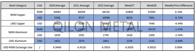 SMM Copper and Aluminum weekly price on the week 38th, 2022