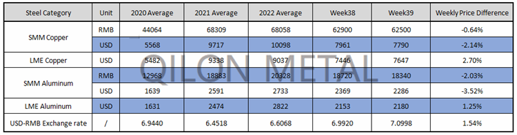 SMM Copper and Aluminum weekly price on the week 39th, 2022