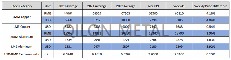SMM Copper and Aluminum weekly price on the week 41th, 2022