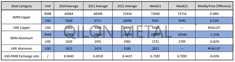 SMM Copper and Aluminum weekly price on the week 22th, 2022