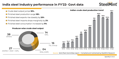 India's finished steel exports reached 13.494 million tonnes (mnt) in FY'22, up sharply by 25% as against 10.784 mnt in the previous fiscal, as per provisional data by the Joint Plant Committee (JPC) under the Ministry of Steel.